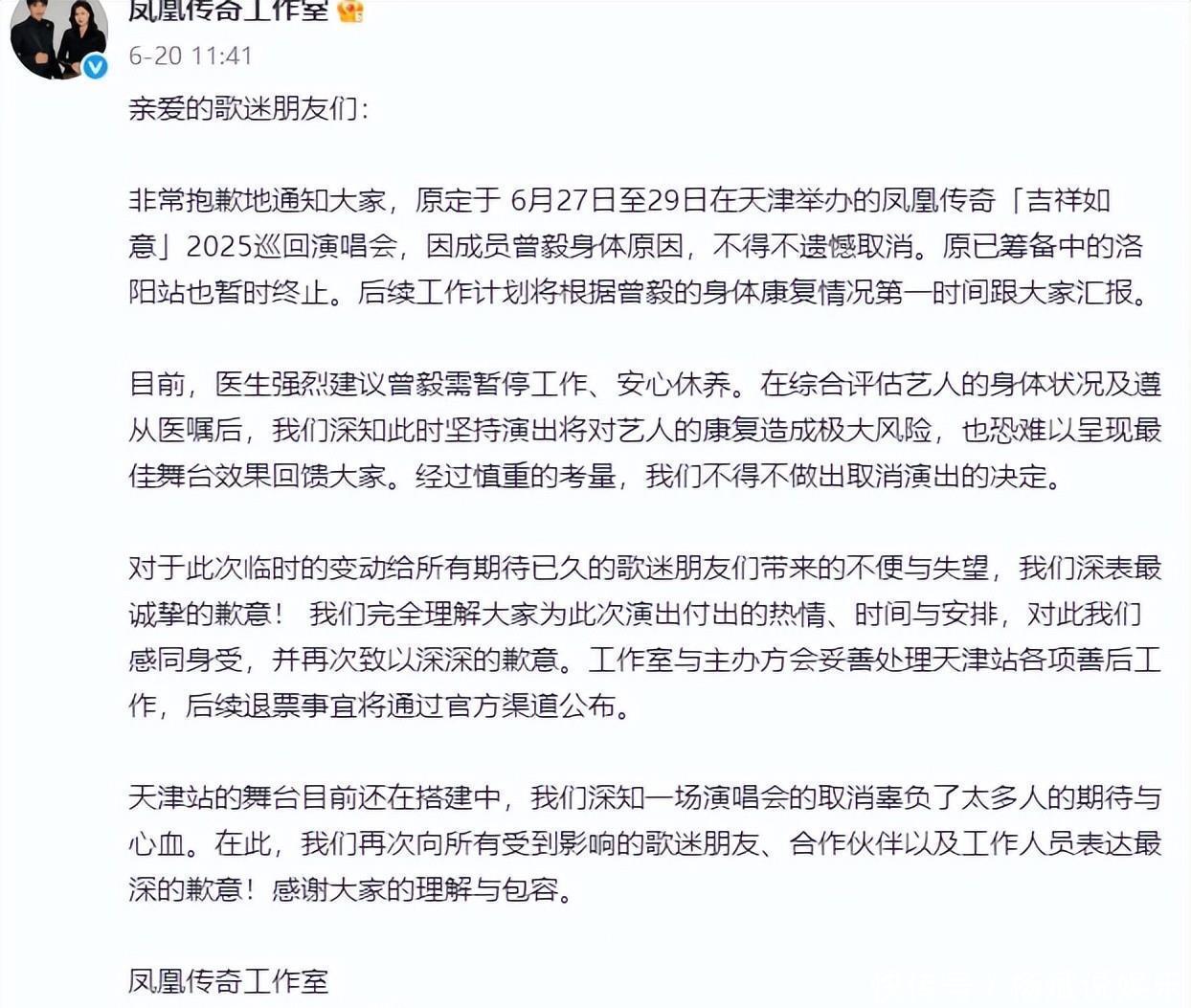 但因为曾毅佩戴的手表原因,凤凰传奇的演唱会之旅就此按下了暂停键,演唱会接连被取消。凤凰传奇工作室6月20日在社交平台上发布“暂停天津举办的“吉祥如意”2025巡回演唱会。”并且告知了成员曾毅因为身体原因,也遗憾的取消了洛阳站,后续计划将按照曾毅身体定调。